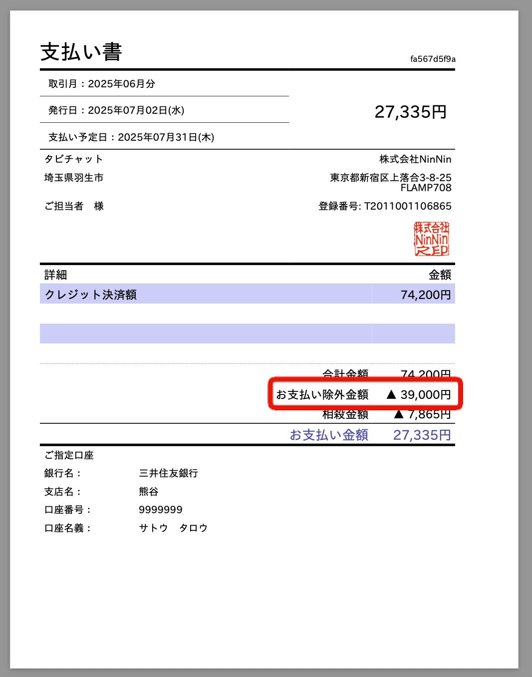 💡Mastercardの返金エラーでNinNinがお客様へ返金をした場合は、施設様へのお振り込みはないため、支払い書にてお支払い除外金額として、相殺するようにしました。