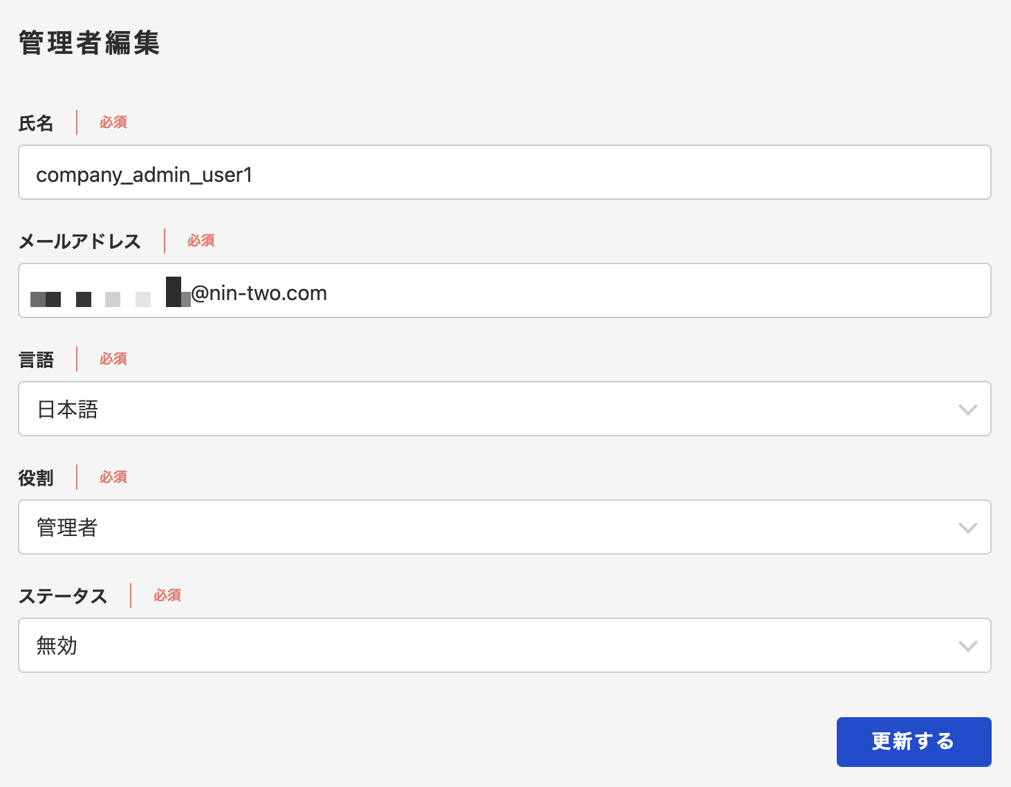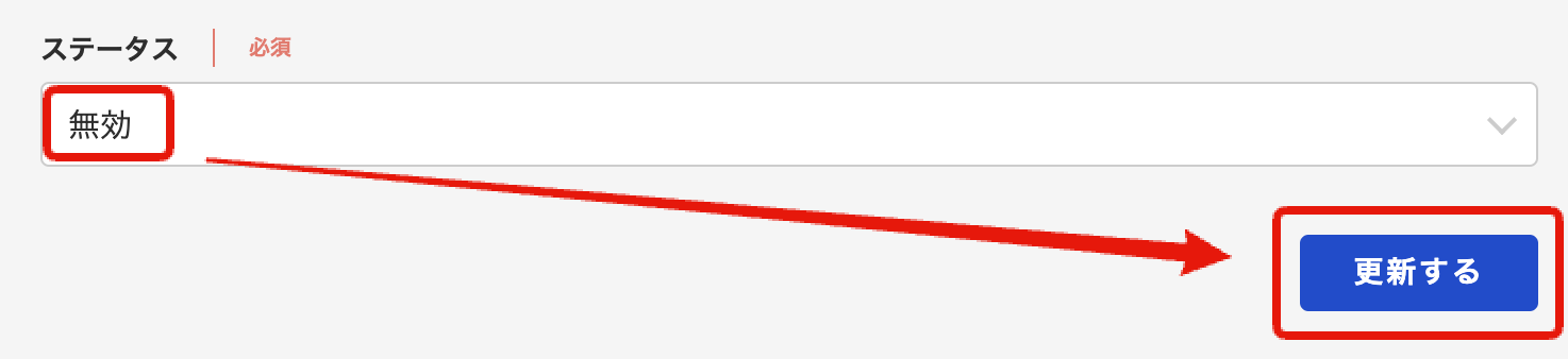 アクション:編集 よりステータス:無効 とし、更新する を押下ください。